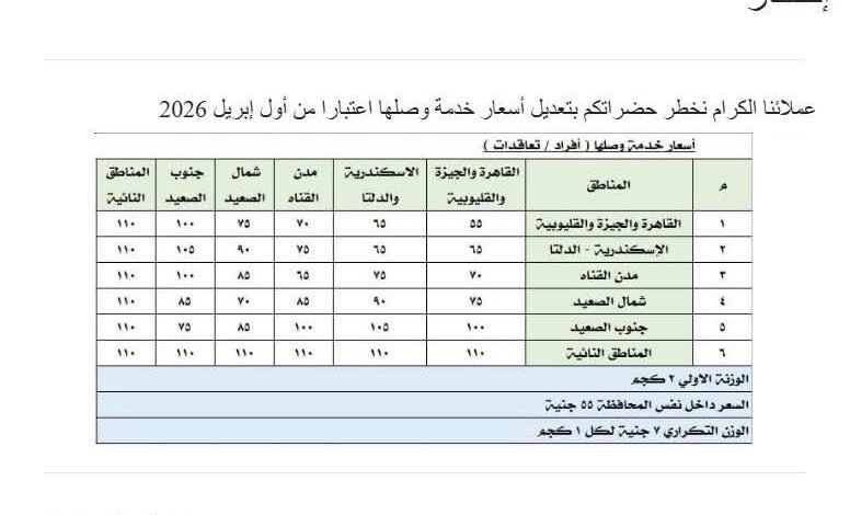 ومن المقرر أن يبدأ تطبيق التعريفة الجديدة رسميًا مع بداية شهر أبريل المقبل، وفق الإخطار المتداول، وهو ما يدفع المتعاملين مع خدمات الشحن إلى متابعة تأثير هذه الزيادة على حركة الطلبات والتجارة الإلكترونية خلال الفترة المقبلة.